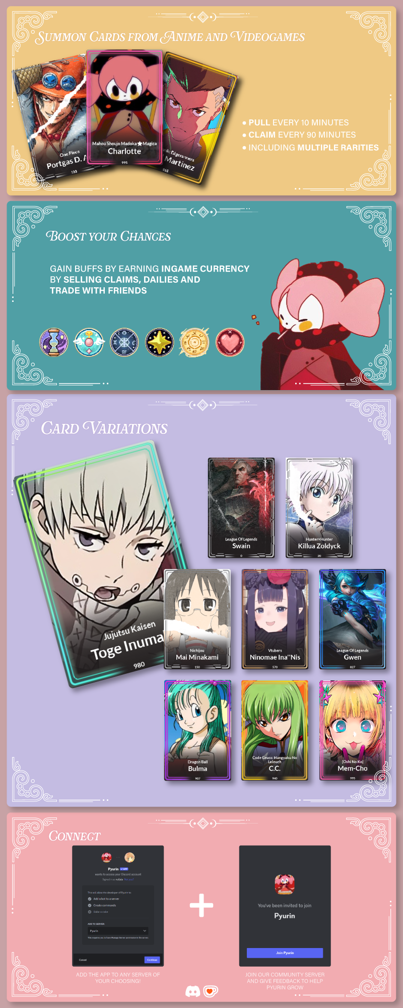 so easily addicting to play, super fun, and aesthetically pleasing!! this bot has soo much potential and i look forward to seeing it grow and expand! i prayge one day i get get giga rarity of my favorite characters <3