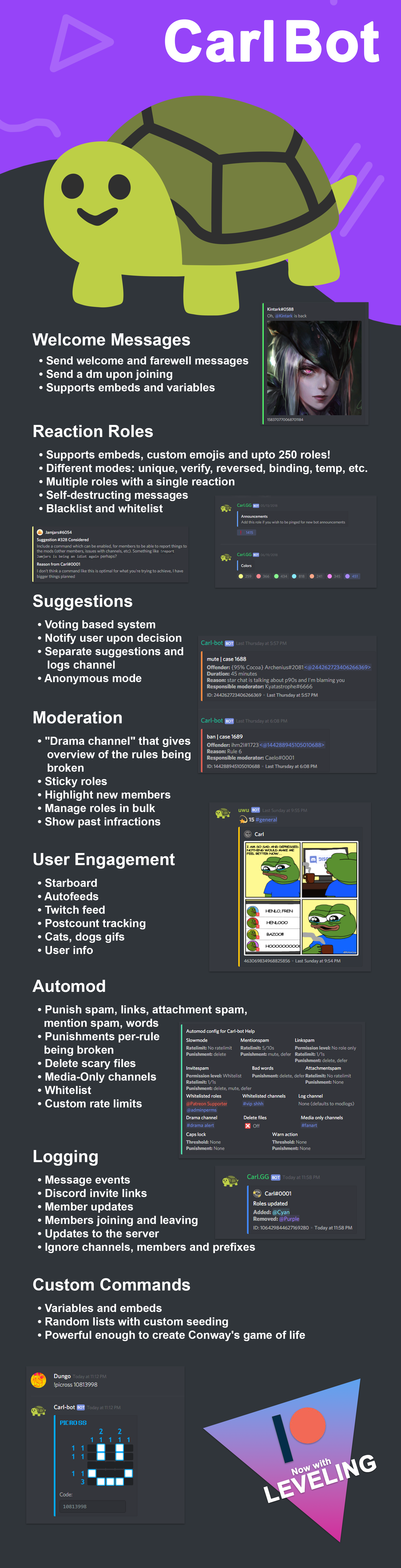 Custom commands, reaction role assignment, twitch, starboard, polls, levels, moderation, logging, timers, announcements, Dashboard