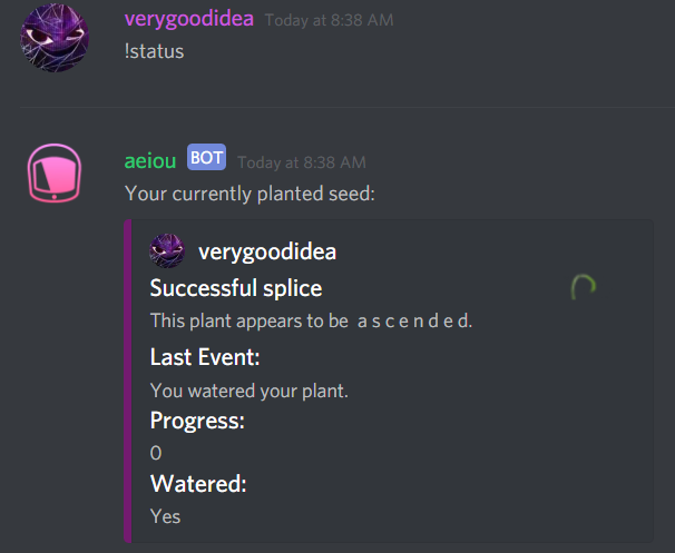 Aeiou brings to your server a host of common games, including classic Trivia and word unscramble, but he also brings unique games of his own, like plants, where you grow and manage your own flower, and gangs, where you can create, join and betray gangs. Type !begin to start with these games.