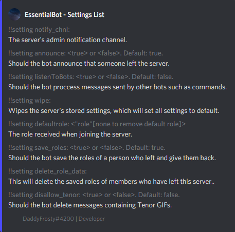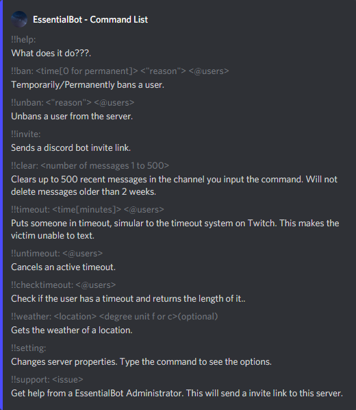 The EssentialBot has essential features for a server like Temporary bans, Timeout system, Automatic Deletion of Tenor GIFs, Default role, and much more.