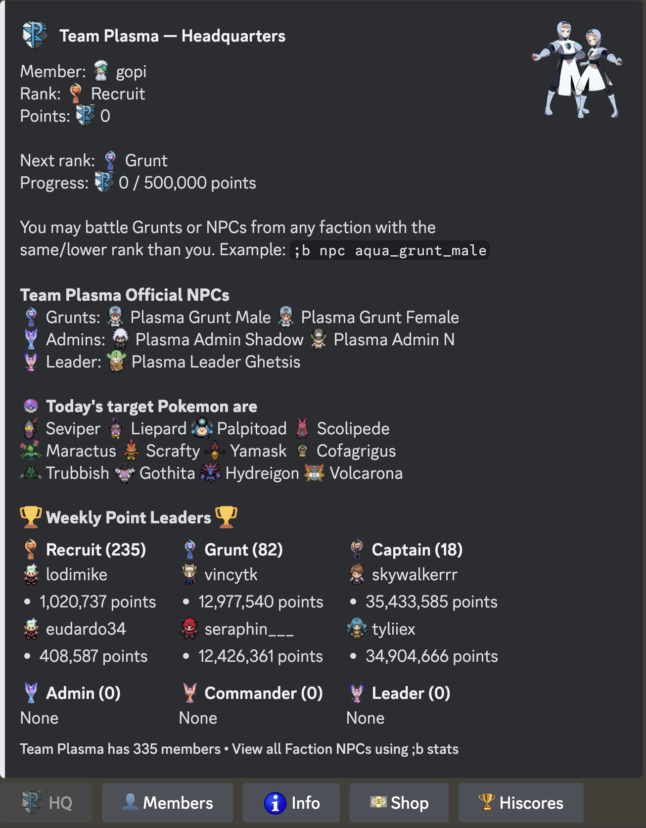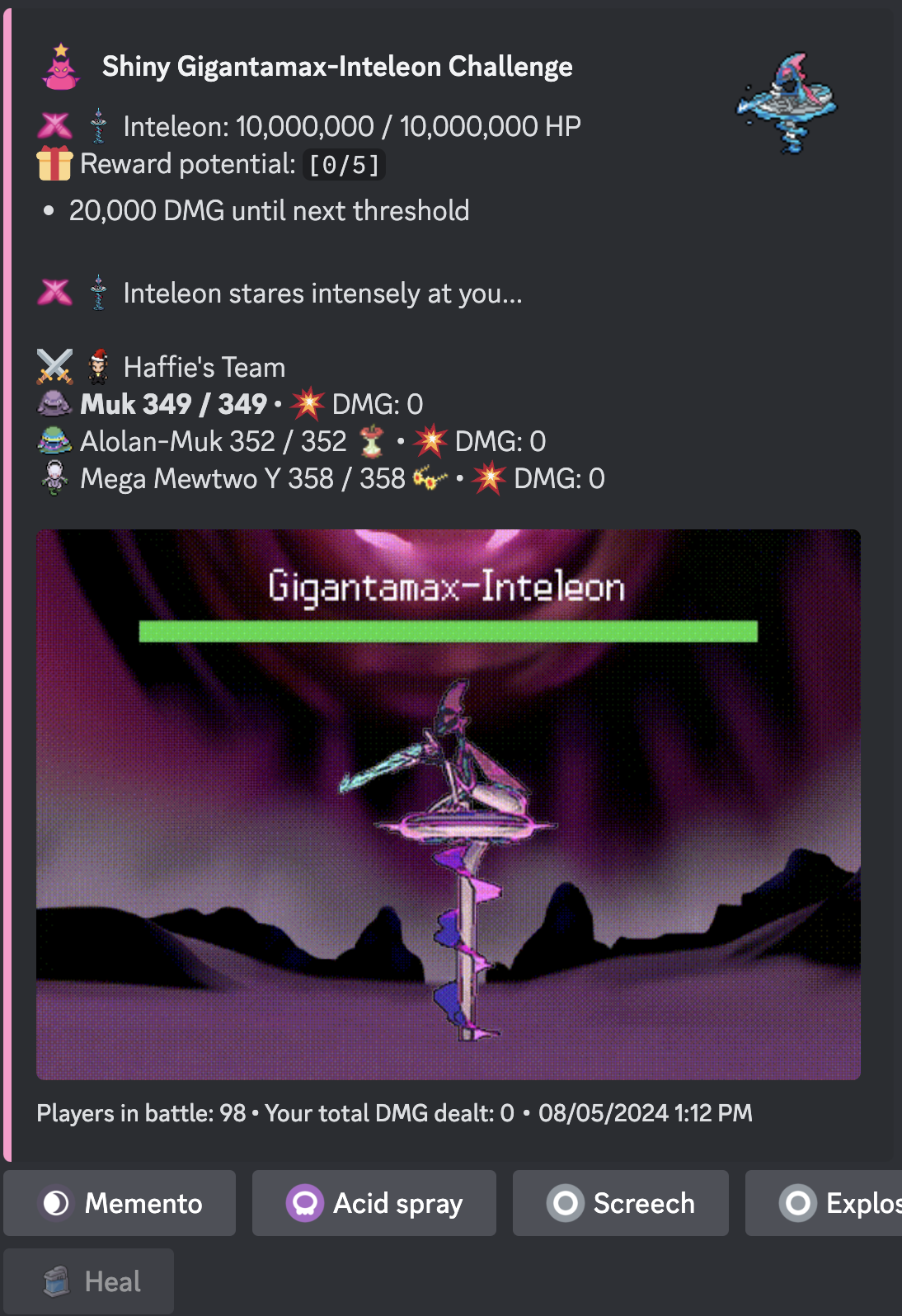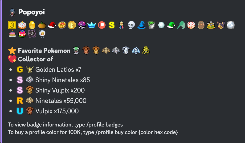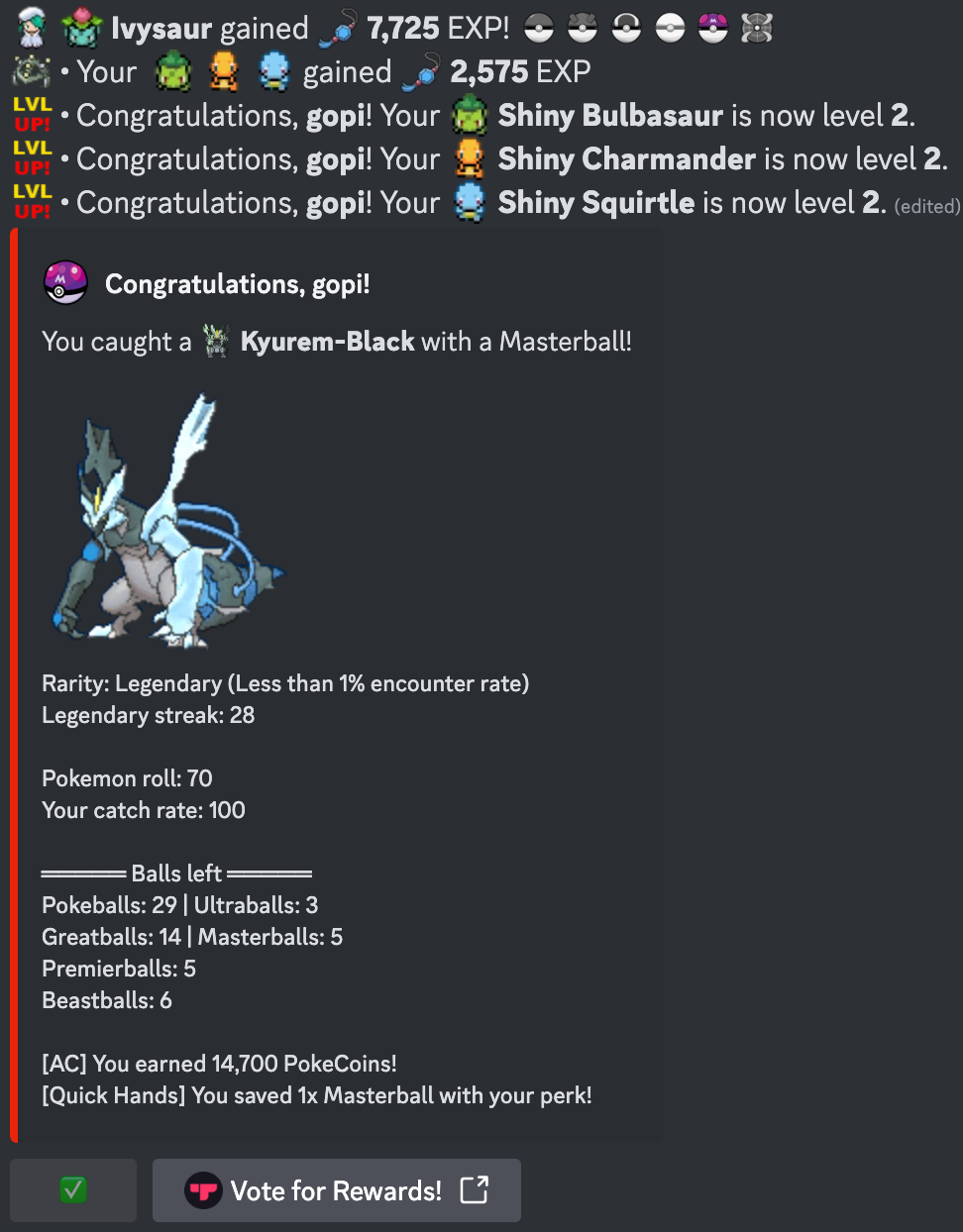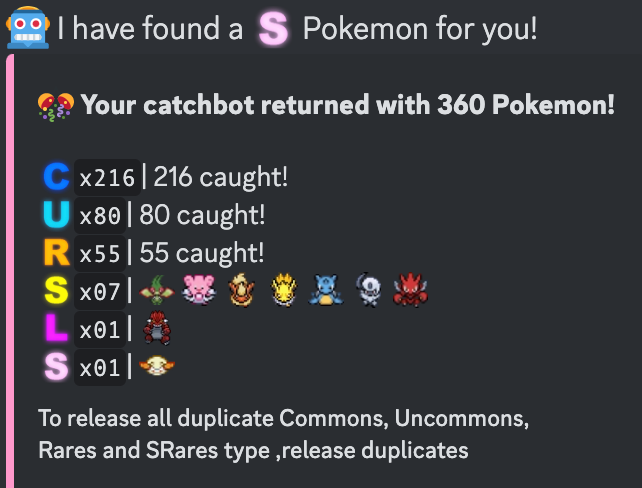 Honestly one of the best discord bot games I have ever played. Great concept based off a already great base game. The only issue I have with it, is that it is unforgivingly difficult to finish any sort of event as a casual player. You have to drop countless hours OR get lucky to be able to get any of the rare golden pokemon. There are times you can play for 12+ hours and not get even a single piec...