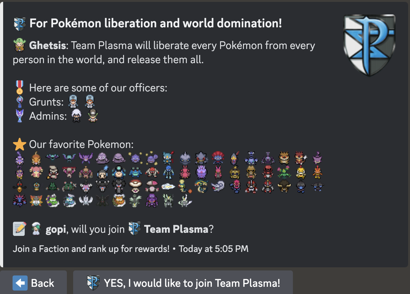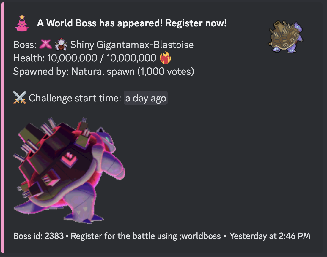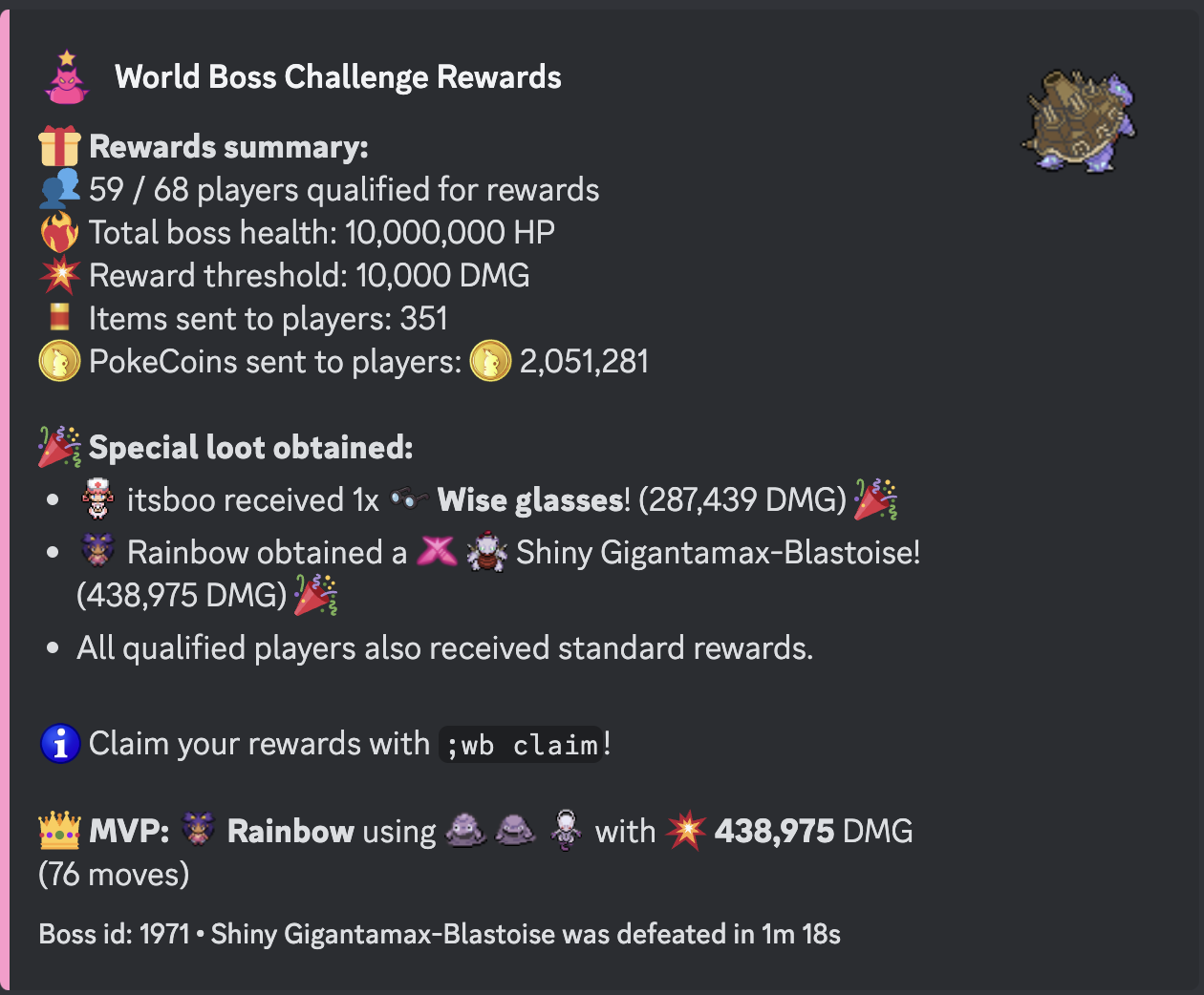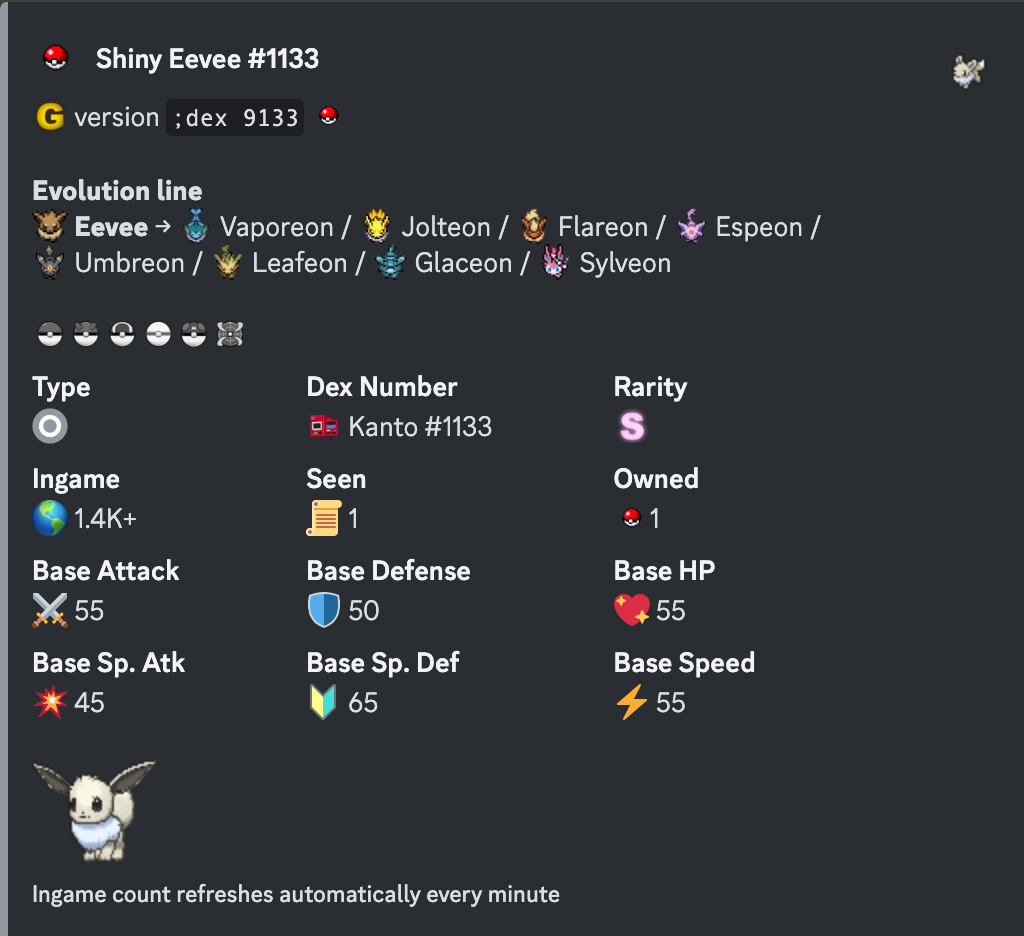 Honestly one of the best discord bot games I have ever played. Great concept based off a already great base game. The only issue I have with it, is that it is unforgivingly difficult to finish any sort of event as a casual player. You have to drop countless hours OR get lucky to be able to get any of the rare golden pokemon. There are times you can play for 12+ hours and not get even a single piec...
