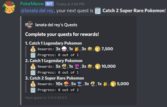 ;quests command• Get a new Quest every 2 hours and complete them for rewards.