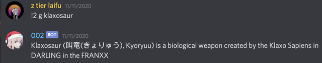 002 (Zero Two) replies to keywords (i.e. "02") with GIFs/banter; plays games; and googles things!