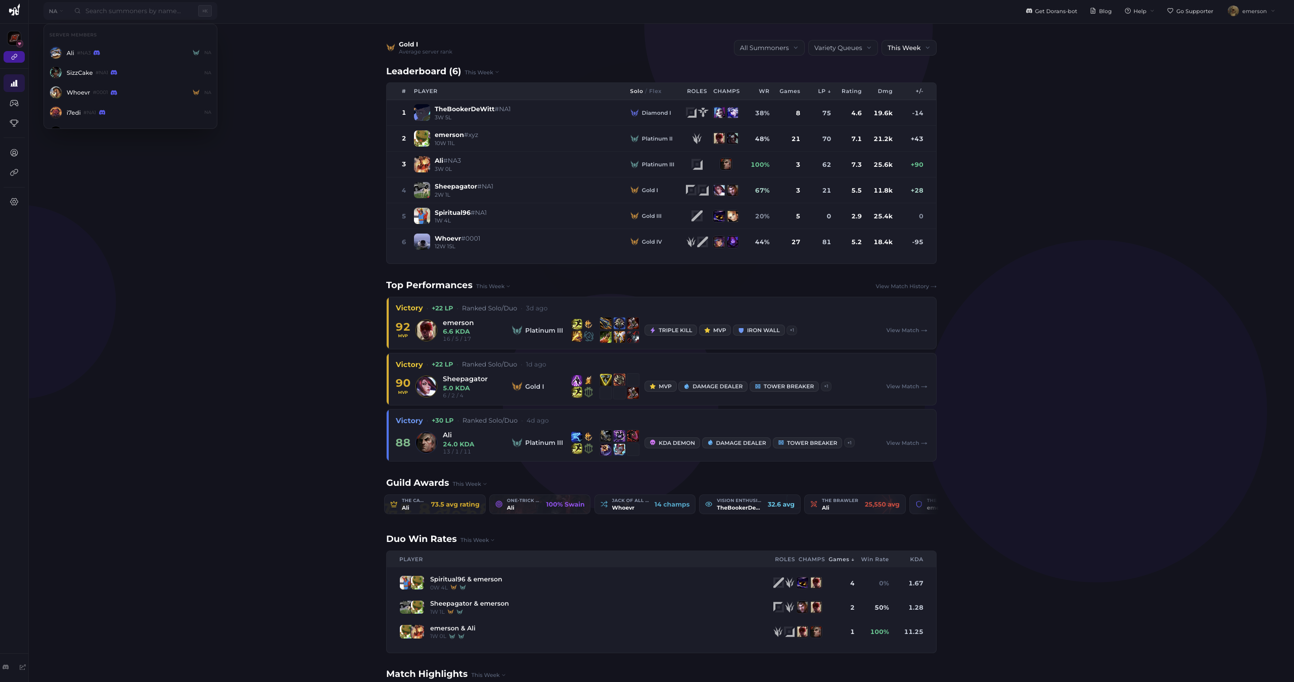 learn more at dorans.botEvery server gets a dedicated web page with match history, profiles, leaderboards, and analytics.