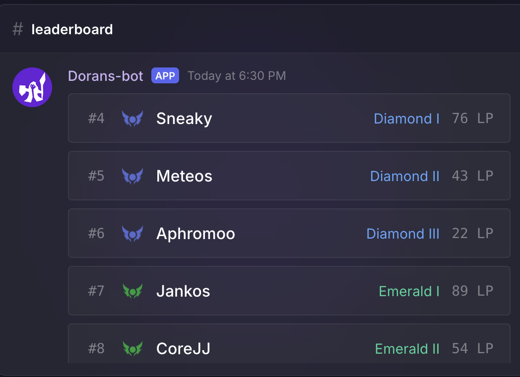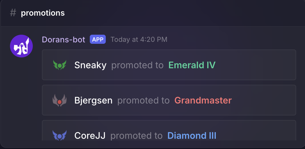 learn more at dorans.botEvery rank up from Iron to Challenger gets announced so the whole server can celebrate.