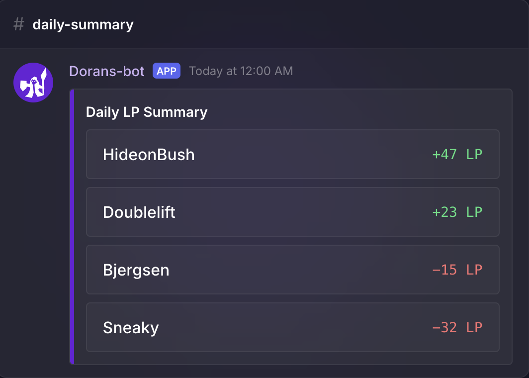 visit dorans.botEvery ranked game tracks LP gained or lost. Daily recaps show who climbed and who fell.