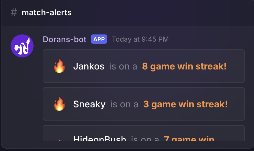 learn more at dorans.botWhen someone is on a heater, the whole server knows. Streaks get called out automatically.
