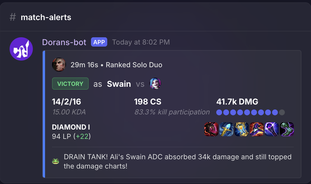 Every game posted to Discord the moment it ends. KDA, LP changes, items, damage, and fun facts.