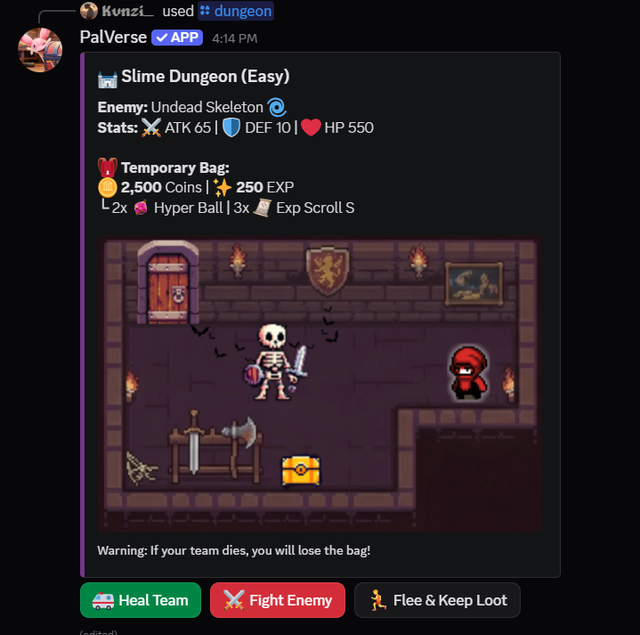 🏰 Roguelike Dungeon Expeditions Use a Dungeon Key to step into the unknown! Navigate through mysterious doors, face randomized monster encounters, and gather loot in a temporary bag. Defeat the final Boss to claim your treasures (including exclusive Player Armors!), but beware: if your entire team faints, you lose all the loot you've collected inside! Will you flee safely, or risk it all?