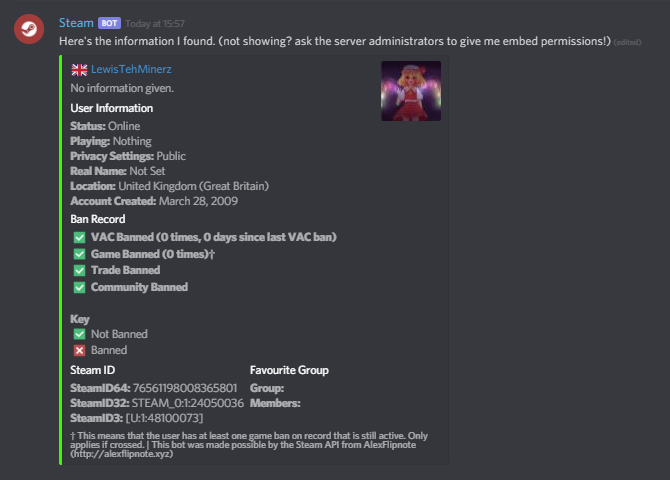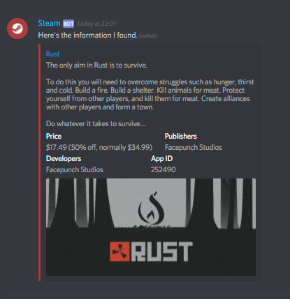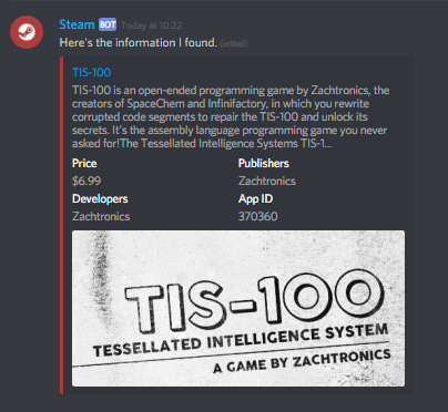 Steam is a profile and game search bot for Discord. It allows users to search their Steam profiles (or others) and Steam games without leaving their client. With detailed information, it provides a sleek display of the results.