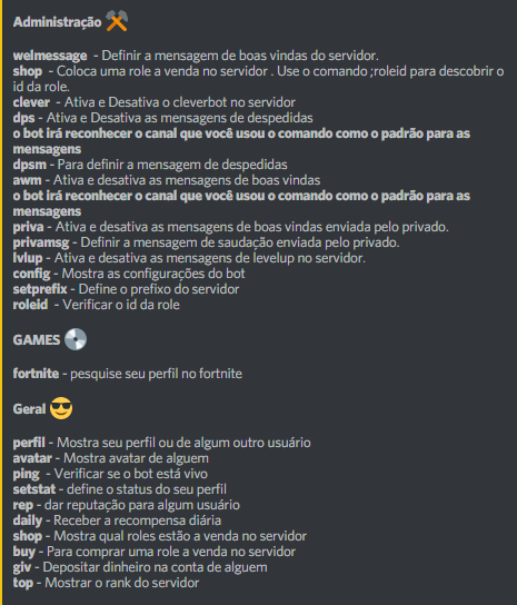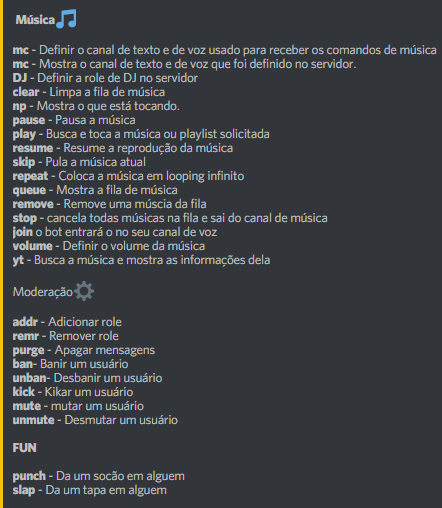 música, moderação, perfil, level, fun e outros