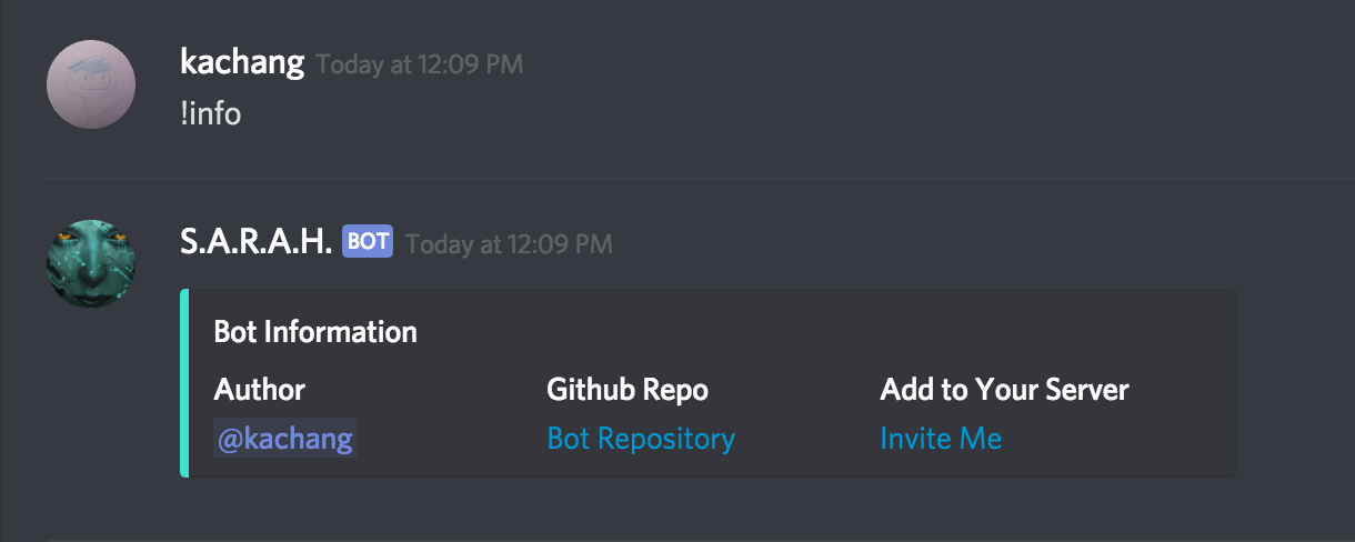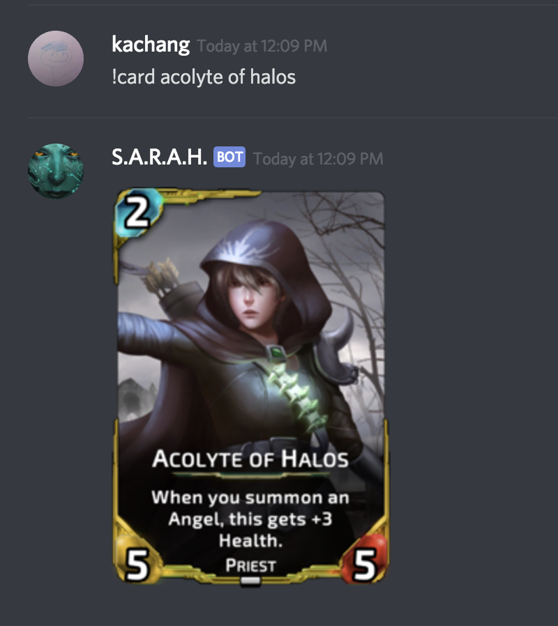The S.A.R.A.H discord bot with also respond with cards if their names are contained in brackets (e.g. [suprise attack]).