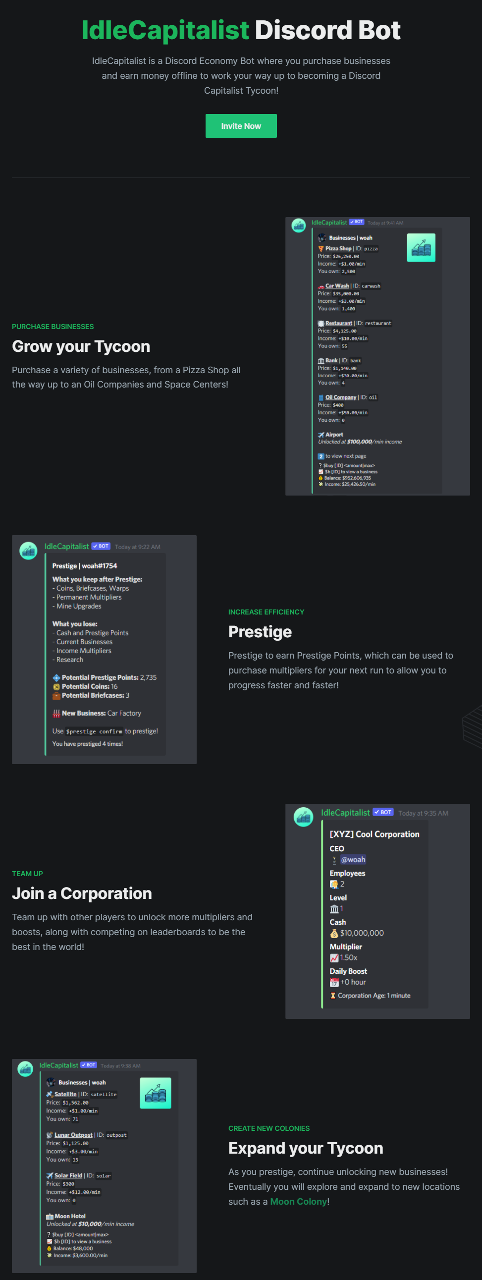 Purchase businesses and earn money offline to work your way up to becoming a Discord Capitalist Tycoon!