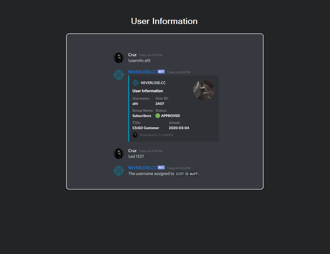 NEVERLOSE.CC is a bot for discord servers. This bot can help you get informations of any user.