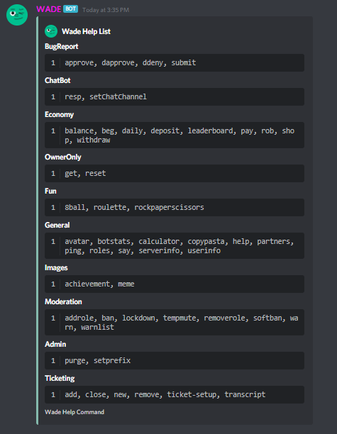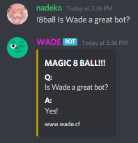 With tons of robust features such as an economy, an AI chatbot, image generation, ticketing, and more, Wade is the only bot you'll ever need. We have an experienced developer team that spends many hours per day ensuring you'll love Wade, you'll never get bored of it! Along with tons of features, we even have a web dashboard where you can edit features instantly with just a few clicks!