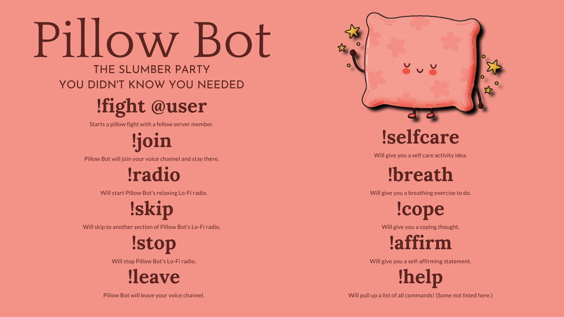 Pillow Bot is a Discord blanket fort/slumber party bot where you can engage in pillow fights with friends and listen to a lo-fi radio.