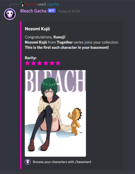 Use /gacha command to roll random waifu or husbando from popular anime/manga Bleach!