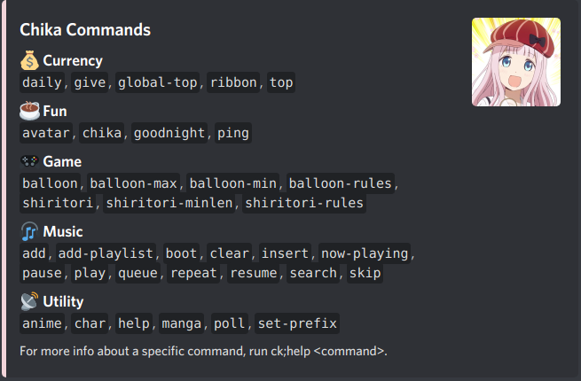 You can also have a chat with Chika usingck;chika. This costs ribbons, the de-facto currency for Chika bot. Please note that this feature is completely experimental now.