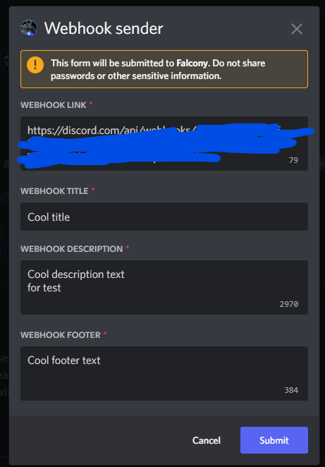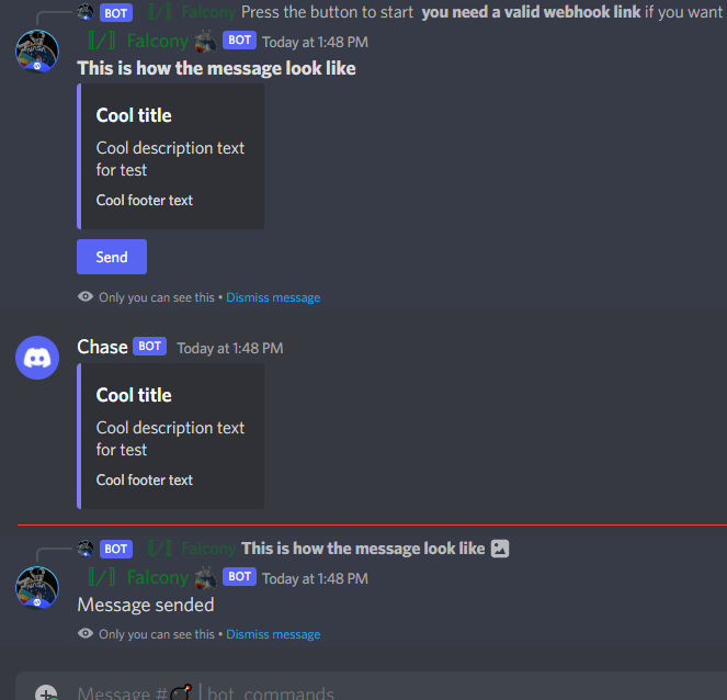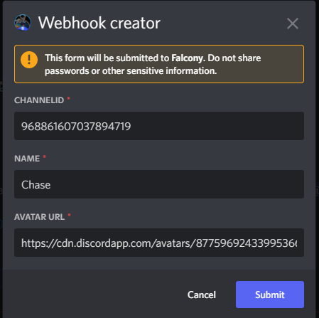 Falcony can be used to manage webhooks on your server or to create webhooks with own name on own channels