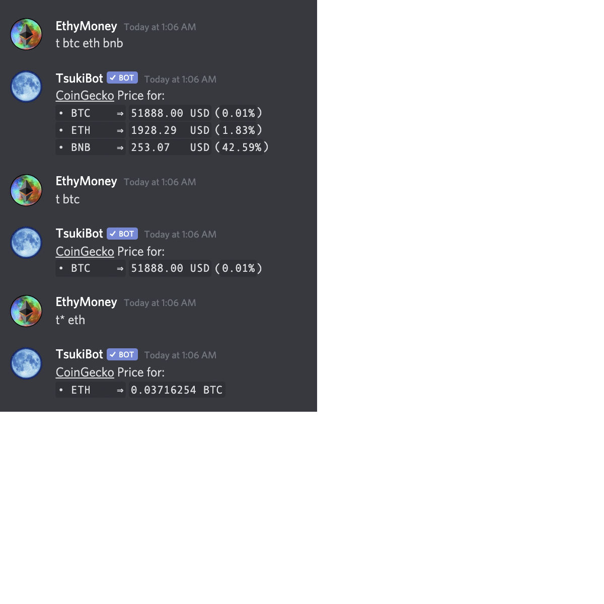 No annoying ads, no limits, no locked features, no referral spam, no BS! TsukiBot is a very powerful and easy to use Discord bot that makes for an excellent addition to your Discord crypto community!