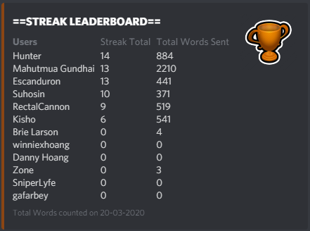 !threshold <amount>) of words required to get a streak!!voice threshold <amount> optional:<minute|hour>) of accumalated voice time required to get a streak!!streak me) for certain word counts, such as 500, 1k, 10k , and higher word counts!Basically, the bot counts your words and how long you have been in call (unmuted), and if you reach a certain threshold for server streaks (default 100 words| 2 hours for voice), you'll get a server streak point and 500 words gets you a global streak point. You can get one server streak point, and one global streak point each day,