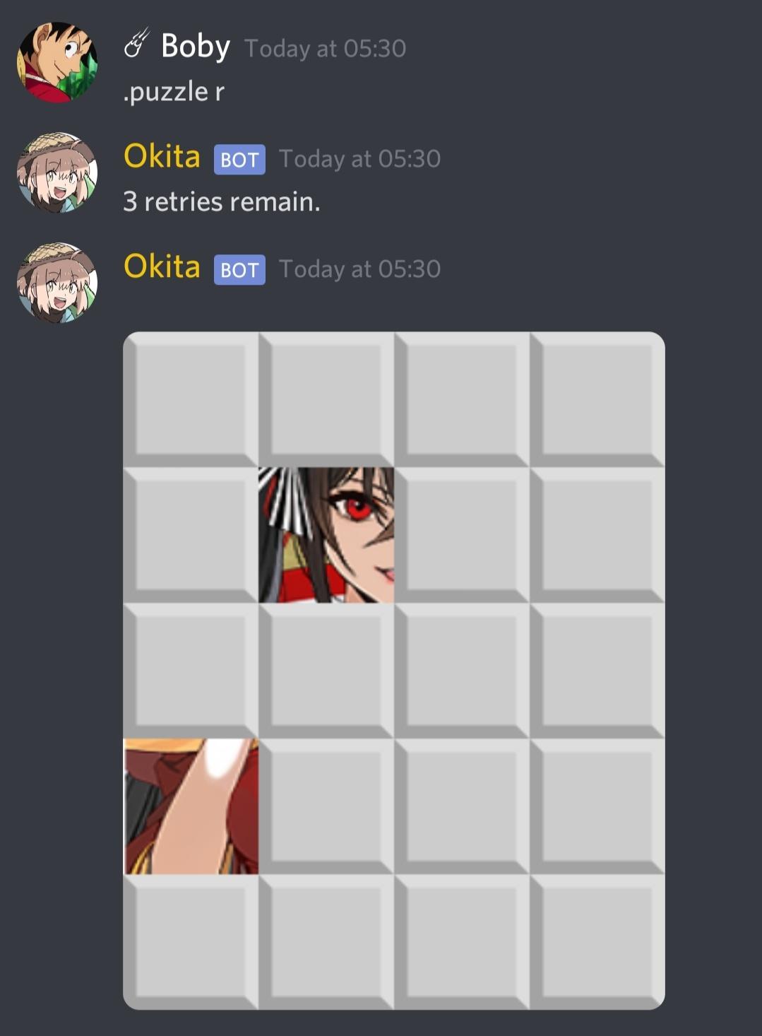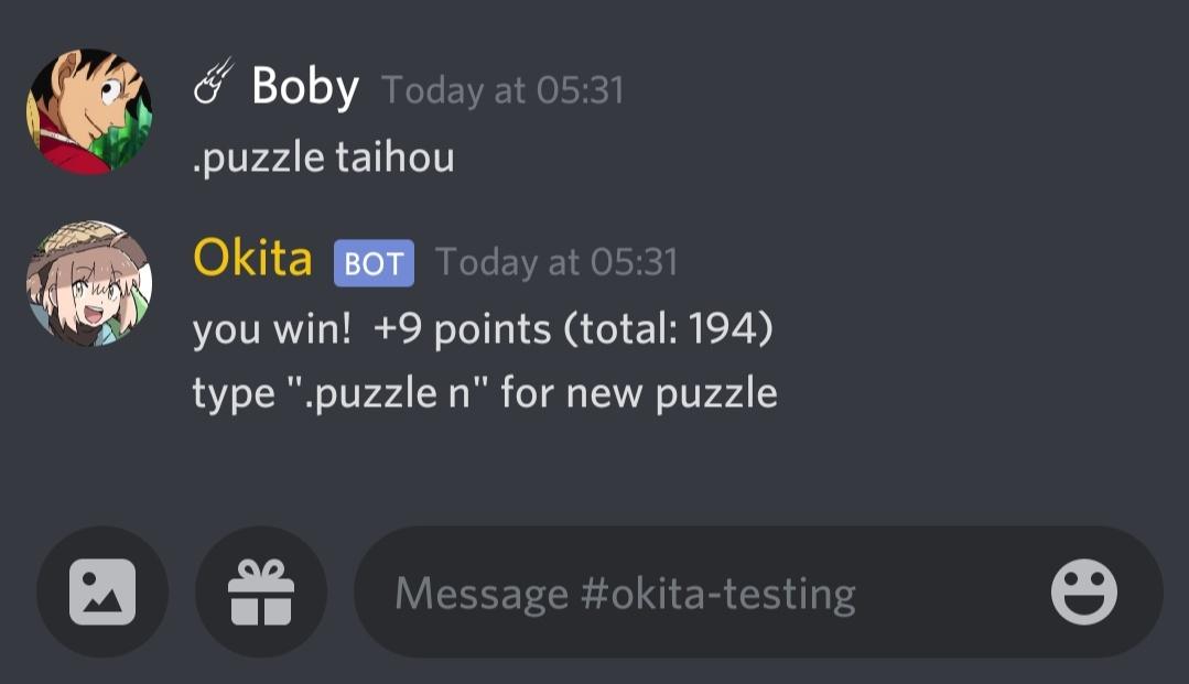 Okita is a Fun and Utility Bot. Currently includes: Anime Puzzle Game.