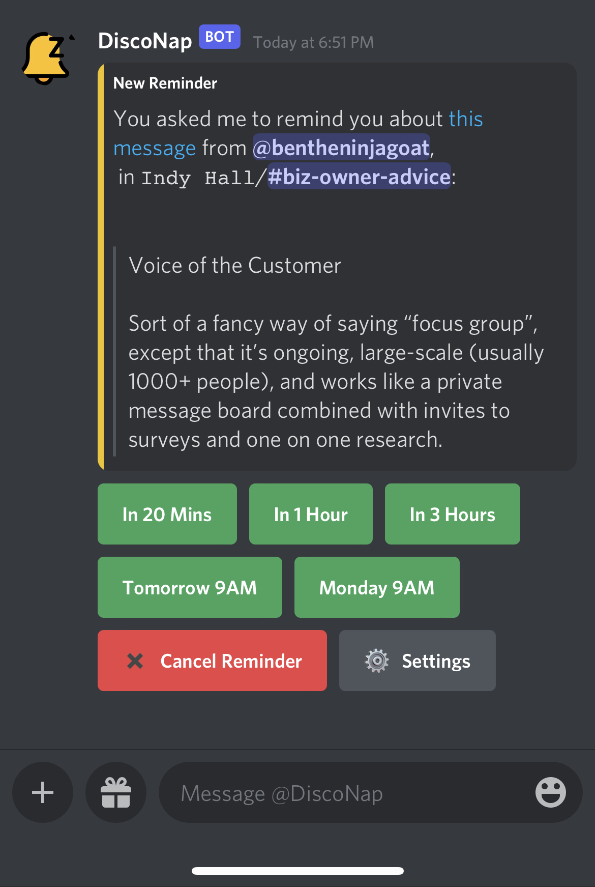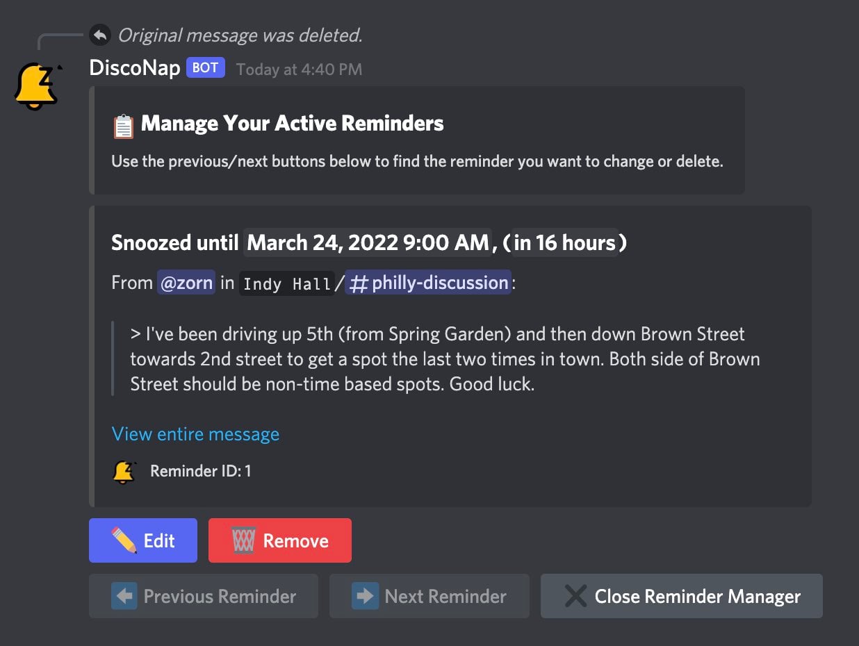 The DiscoNap bot lets you quickly (and invisibly) set a reminder on any message in your Discord server, and be reminded about it later via a private DM that includes a preview of the message along with a link directly to the spot where you can pick up the conversation.