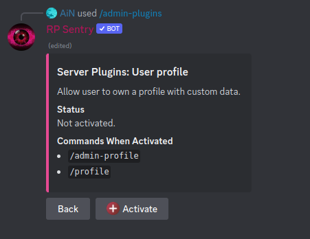 /admin-accounts: Change this server accounts name and emoji /admin-actions: Manage action settings /admin-add: admin command to add shop items/categories /admin-check: check user data /admin-create: Creates features like item, account, shop, job, recipe. /admin-currency: Change this server currency name and emoji /admin-edit: admin command to edit features such as item, shop, job,.. /admin-give: Give/Take currency, items... out of thin air /admin-item-list: show the server created items list /admin-lock: Lock or unlock the commands for users /admin-log: manage log channel /admin-mass-action: perform mass action on all users in your server /admin-messages: edit the bot messages /admin-onuse: change on use behavior of items /admin-plugins: Manage the server plugins /admin-delete: delete an item, shop... /admin-reset: general command to reset users like inventory, balance /admin-settings: Allow you edit the settings of features /admin-tier: admin command to check the tier /admin-language: Change your server bot language!