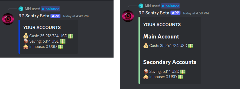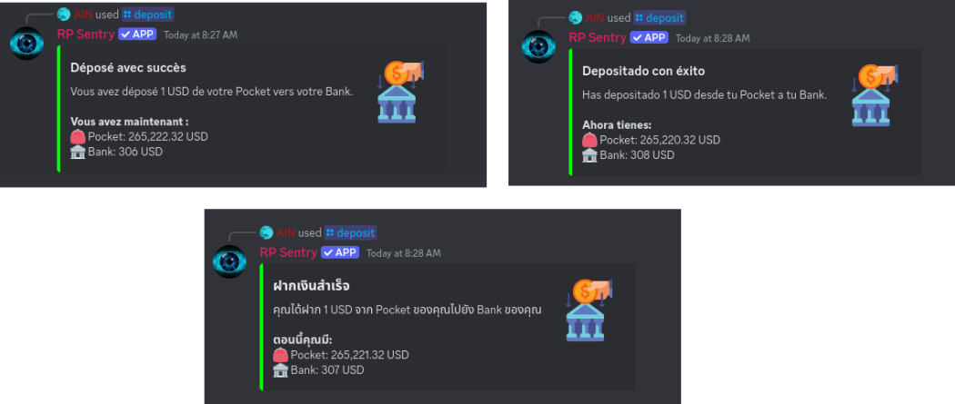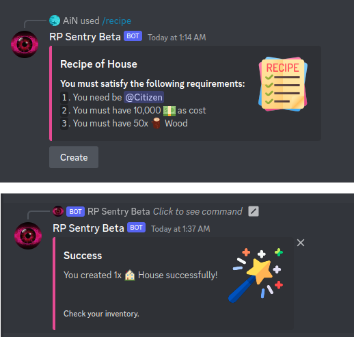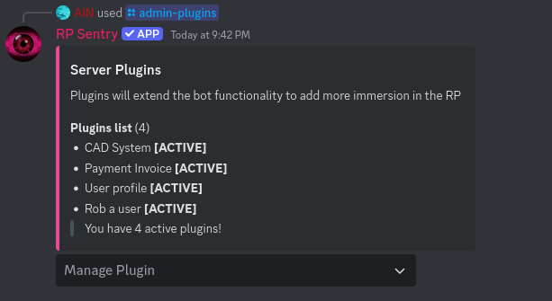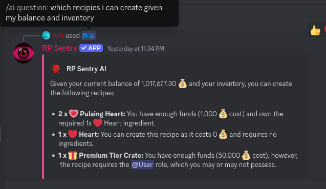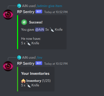 /911: Call 911 and file a report! /action: Perform an action /ai: Beta, ask AI anything in your RP, such as balance, inventories and so on. /balance: Show your balance /deposit: Deposit currency to your secondary account (like a bank) /get-started: Your friendly guide as a first step to enjoying the role playing /help: See my guides and commands list /inv: Shows your inventory content /item-info: Show information about an item in your inventory. /job: Helps you earn balance by clocking in and out from jobs /leaderboard: Show the server's top users /manage-shop: Manage your shops /server-status: Check the server status /premium: Get premium and gain more perks across servers /recipe: Create an item from a recipe /retrieve: Retrieve an item from a secondary inventory to your main inventory /send: Send balance or items to another user /shop: Buy an item from a shop inside this server /store: Store an item from your main inventory to a secondary one /trade: Trade items, balances with another user. /use: Use an item from your inventory /vote: Support the bot by upvoting it and get unique benefits. /withdraw: Withdraw balance from your secondary account to your main account /body-search: Body search a user's inventory and seize items /cuff: Cuff a user /jail: Jail a user /uncuff: Uncuff a user /unjail: Unjail a user /invoice: Send a payment invoice to a user /marketplace: Sell and buy items from the marketplace /profile: View your profile /rob: Rob a user
