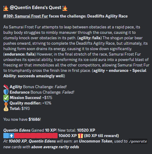 Send your creations on quests to earn gold, fight together as a server to take down raids, or duel other players. Generative AI will come up with unique scenarios for all of these, dynamically adapting to incorporate the characters you use and create limitless stories!