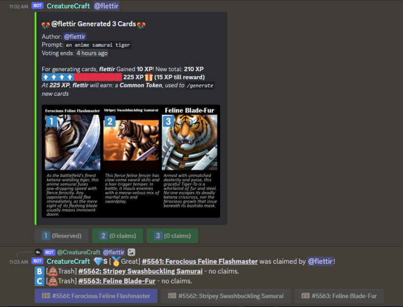 CreatureCraft is a Discord bot that allows players to create and collect unique companions, powered by generative AI. Every character in the game is made by the players! Send your companions on quests in an unlimited number of scenarios, all of which are also AI-generated and dynamically incorporate your chosen characters. Collect companions, upgrade them, trade, duel other players, raid with friends, and more!