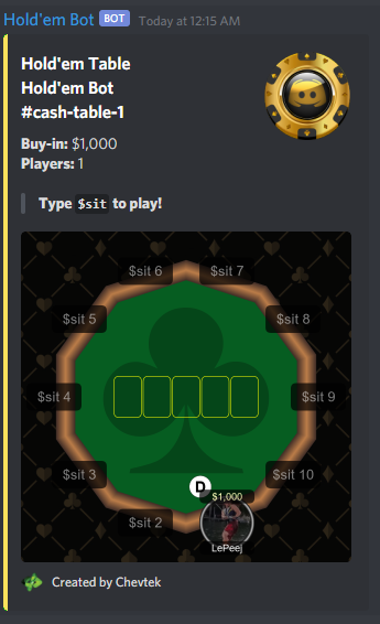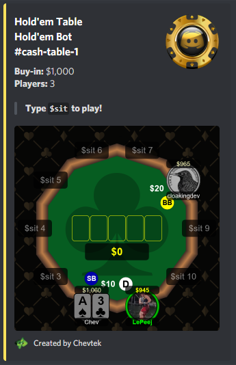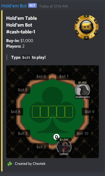 $create. This will create and render a default cash table in the channel.$sit to take a seat at the table. The table will re-render to show the new players.$deal to begin the first hand. The table in channel will re-render to show the blinds being posted but it will also DM each player a render of the table that shows them their own cards.$deal to begin a new hand.Nope! Players can type into the channel or the DM where they are playing a hand and the message will be relayed to the other players' DMs as well as the channel where the game started. Even messages from people watching the game in-channel wil be relayed to the players and vice versa. This makes it easy to communicate via text while playing!
