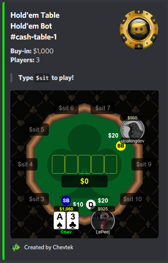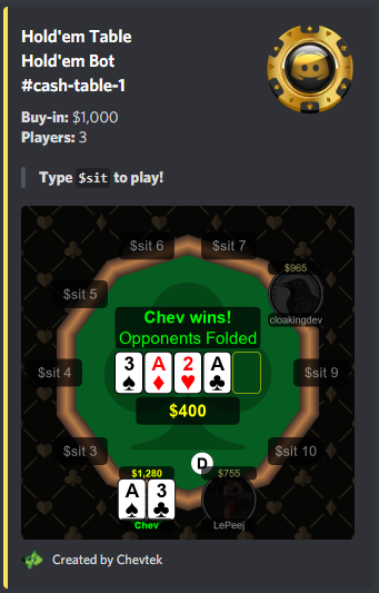 A bot focused on providing a fun Texas Hold'em experience. Complete with visual poker table that updates as you play!