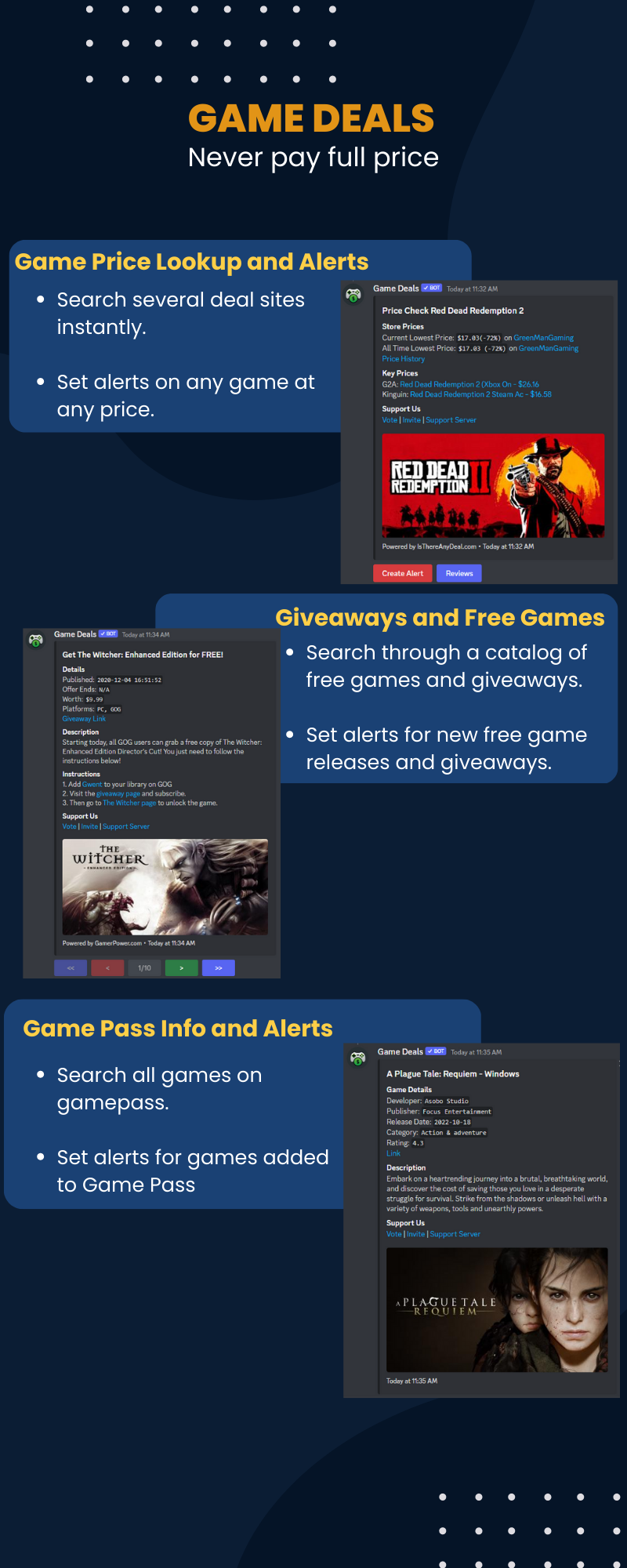 The /alert command allows you to set custom alerts for any game. Just pick the game and the price you want to be alerted at.