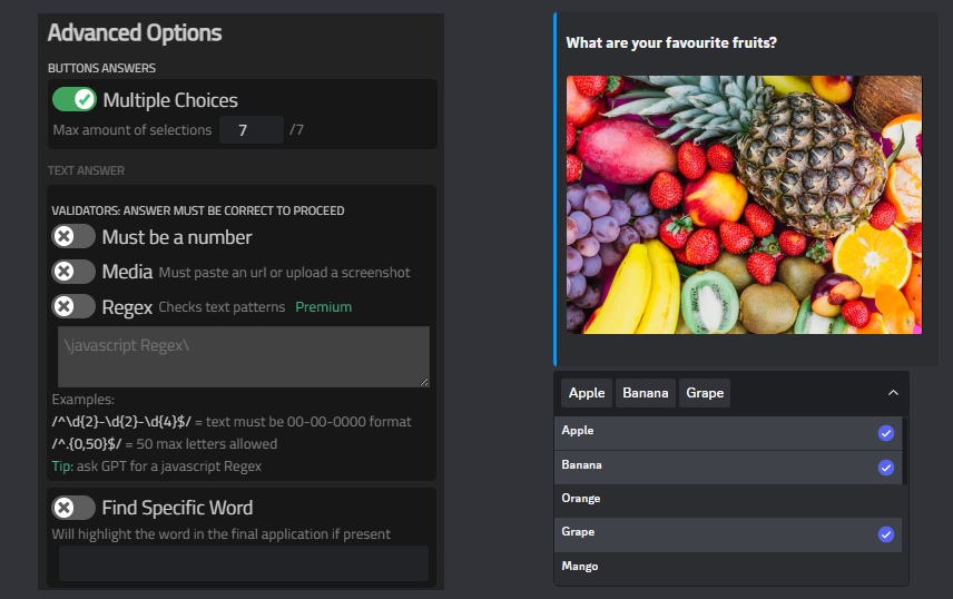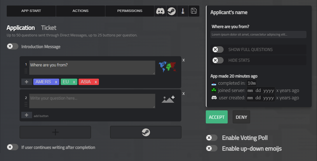Core Specs • Up to 50 questions per application form • Up to 25 buttons per question • Conditional thread pinging based on user selections • Dynamic custom command execution to interact with other Discord bots • Media files from answers displayed directly in application threads • Duplicate applications • Answer validation with regex patterns • 30 free trial applications + montly votes