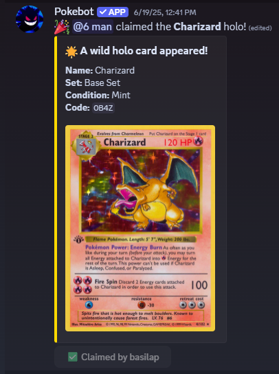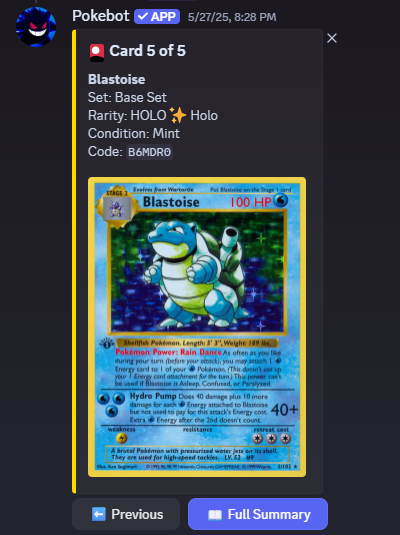 his Pokémon Discord bot is a fantastic find, offering a unique and extensive card-collecting experience. It has an incredible library, spanning from the classic Base Set to the very latest Scarlet and Violet expansions. Beyond just collecting, you can build decks, manage your collection, and even grade your cherished cards. Features like daily rewards and quizzes add a layer of fun and engagement ...