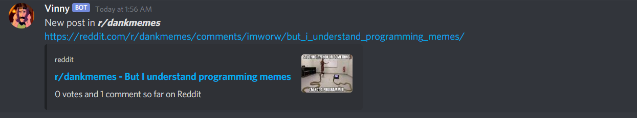 A lot of stuff happens all over the internet, Vinny is designed to bring it all to your discord servers. Open source and made so users have a voice in design and direction. Add Vinny to your server and dont miss out again!