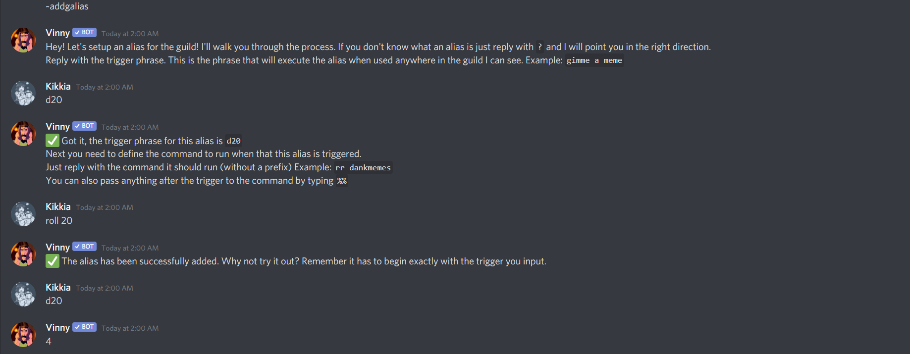 Vinny comes with more than just commands. Any help or suggestions/feedback you may have is quickly answered and taken into consideration.