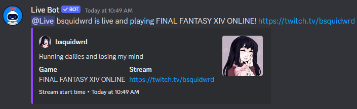 This would be even better if the functionality to assign a LIVE role is added to the bot, especially since Discord has crippled this ability for new streamers with other bots that alredy have this funcationality.