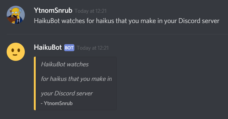 HaikuBot is a simple, fun bot for your server. It detects haikus in 5-7-5 format in your messages and formats them. It uses a dictionary with over 40,000 words and syllables, and a combination of algorithms to try and be as accurate as possible. It works with markdown message formatting and punctuation, as well as most common acronyms and variations in pronunciation.