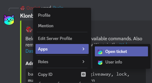 In addition to the traditional opening of a ticket by clicking on the button, the moderator can also open a ticket with the user using the options from the context menu.