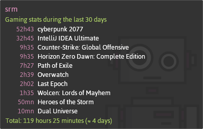 LeRobot allows you to see your playing stats, you listening stats (like Spotify). You can choose the period (last week, last month), your stats are private, but you can make them public to your server