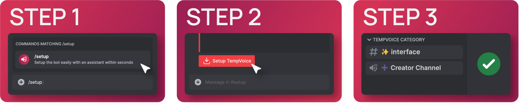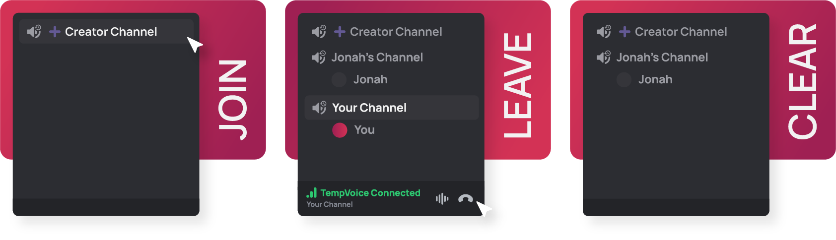 Join a ➕ Creator Channel (voice channel) and the bot will move you into your new channel. Manage your temporary channel by using /voice slash commands or a ✨ Interface Message to edit the name, user limit and permissions of your channel.