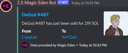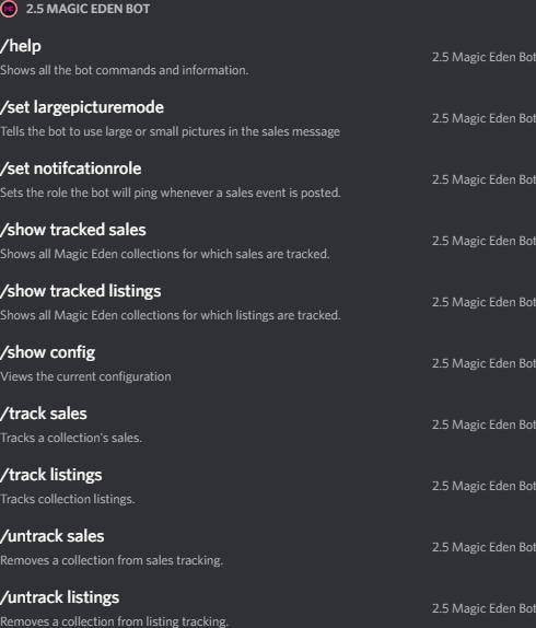 This is by far the best sales/listing bot for magic eden. shows them all the time without a miss. Can't say the same for matrica or metahelix sales bot, they've been super buggy the last couple of months and you have to pay for that service!! for any dao or small project this the best one to get. Again always shows both listings and sales within seconds of each transaction