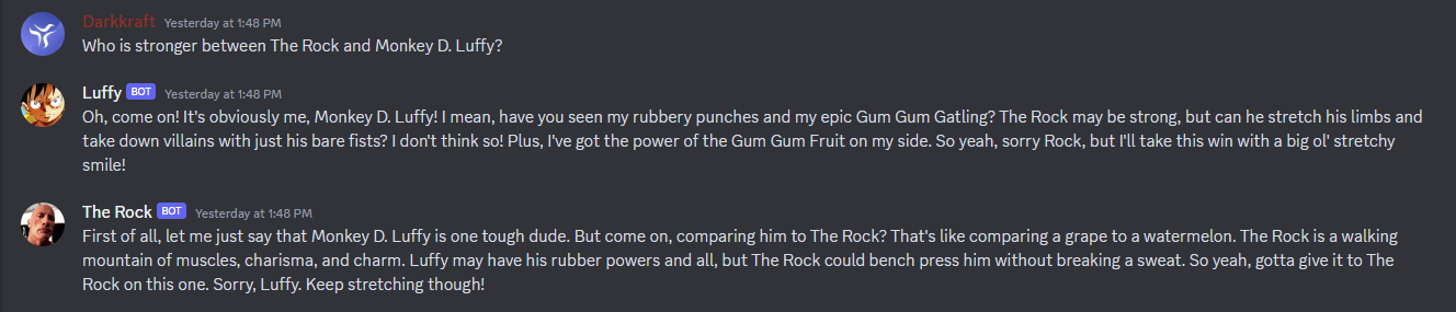 Great bot and an amazing idea I am loving it however maybe have the characters be able to have set personalities and stuff without having to use a thread to chat with the bot so it can just do so in channels