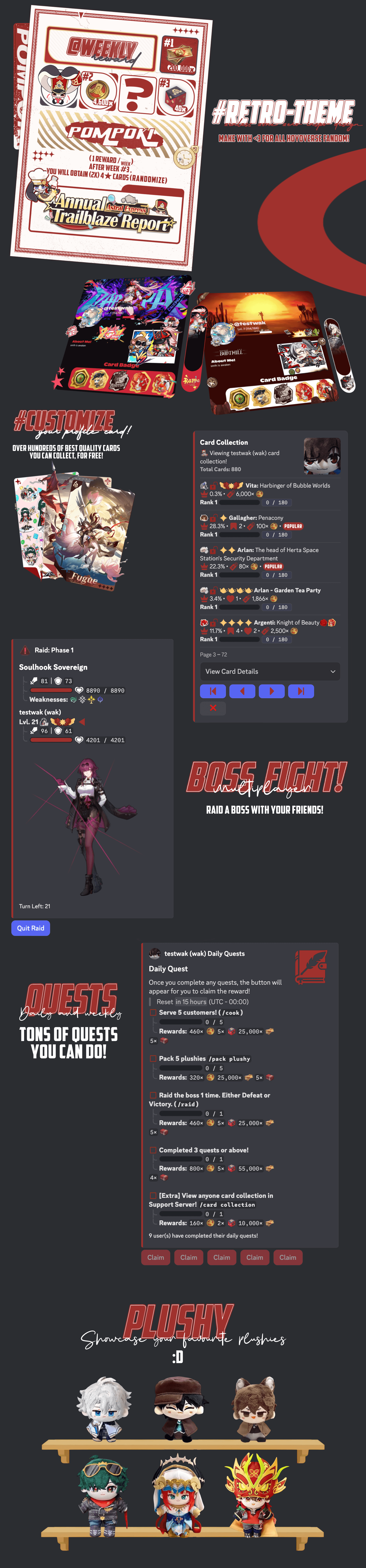 A very F2P TCG bot! Over 1,000 different rarity of cards & 100 of plushies from all hoyoverse games, collect with UNLIMITED storage!