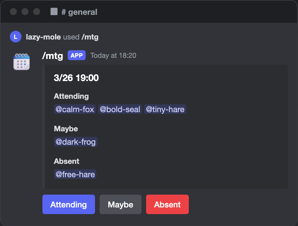 Run /mtg with a title (e.g. a date and time), and the bot instantly posts an attendance card with three response buttons: