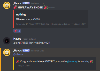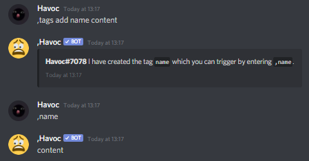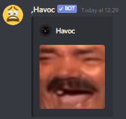 The bot comes with many custom emoji commands that are particularly useful for users without Discord Nitro (users require the HavocEmojis role to be able to use them).