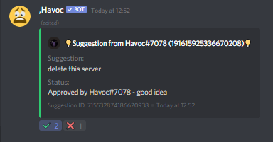 Any user can suggest something which will be sent to the configured suggestions channel (or #suggestions by default).